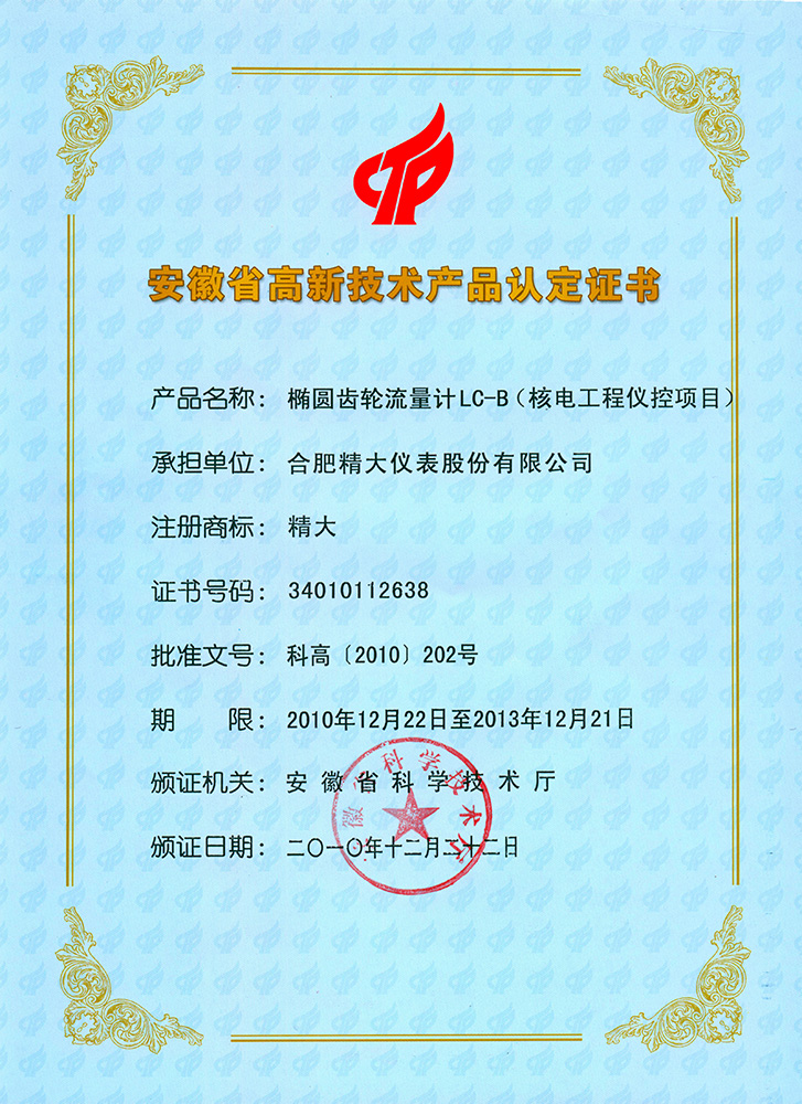 省高新技術(shù)產(chǎn)品認(rèn)定證書(LC-B核電)