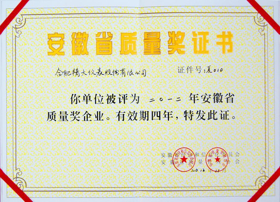 安徽省質(zhì)量獎(jiǎng)證書