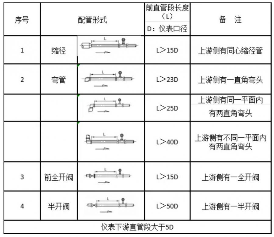2.渦街流量計(jì)的上游側(cè)和下游側(cè)應(yīng)有較長(zhǎng)的直管段。其上、下游直管段長(zhǎng)度根據(jù)管道狀況不同而不同,直管段的具體安裝長(zhǎng)度和要求見下表。